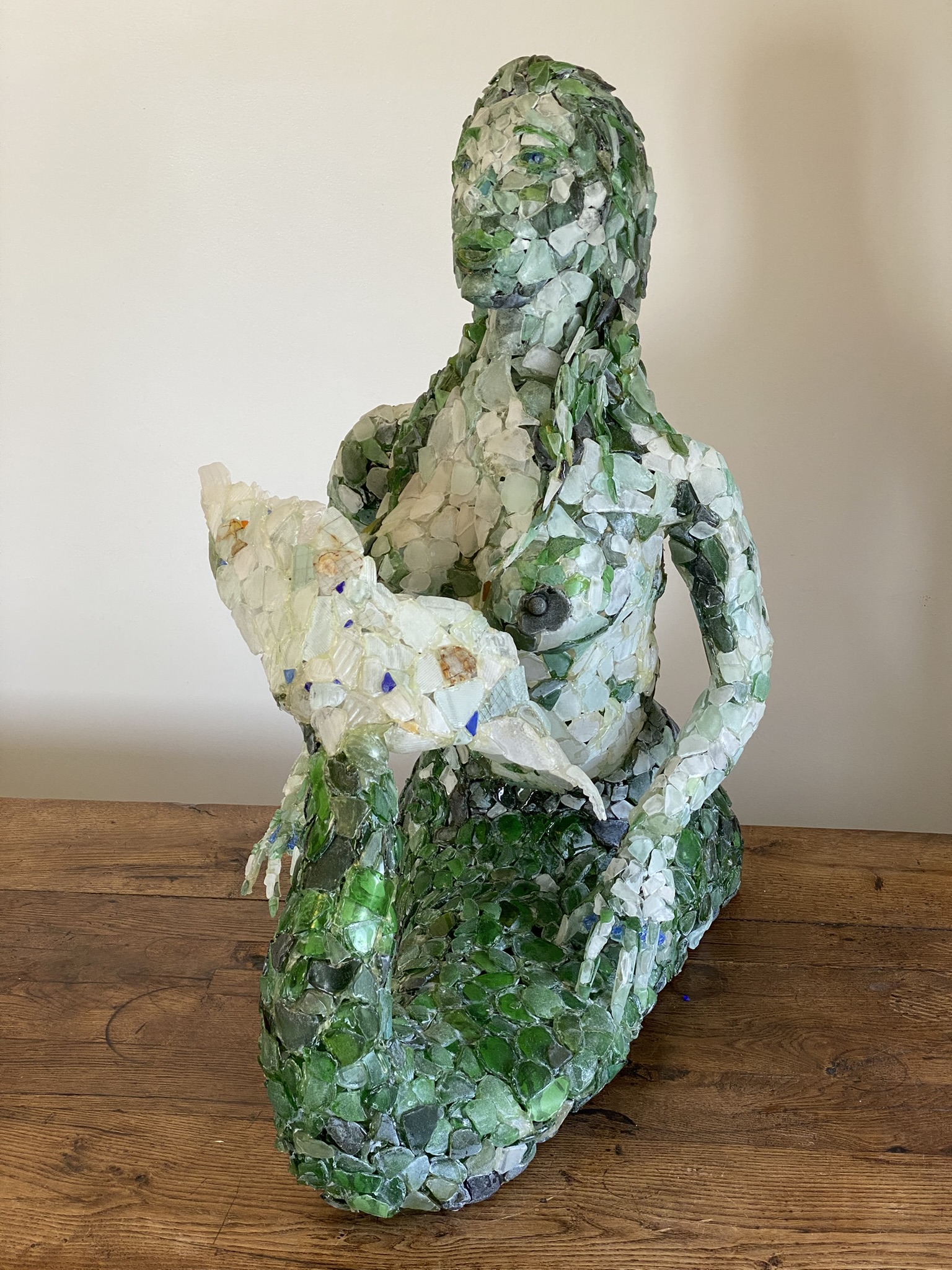« A partir de morceaux de verre poli, ma pensée transforme puis mes mains assemblent des représentations animales ou de ce monde, en sculptures réalistes »